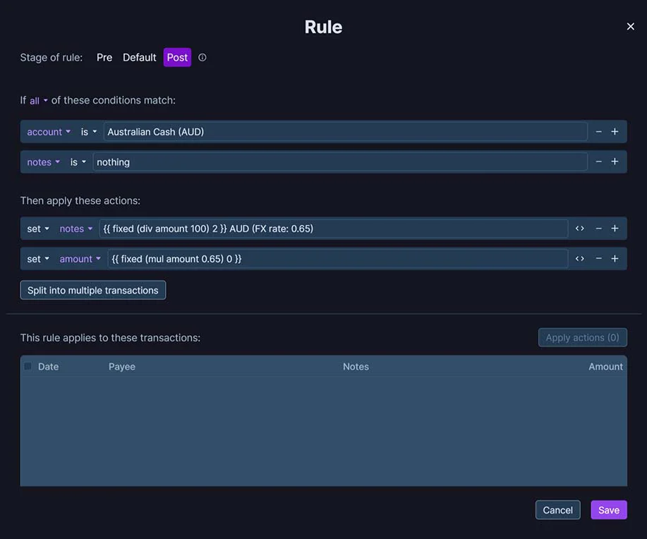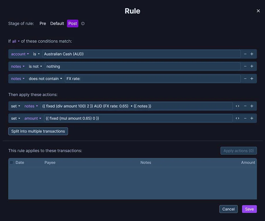 Allof these conditions match.Accountis, and select the foreign currency account.notesis not set to nothing.notesdoes not contain FX rate: