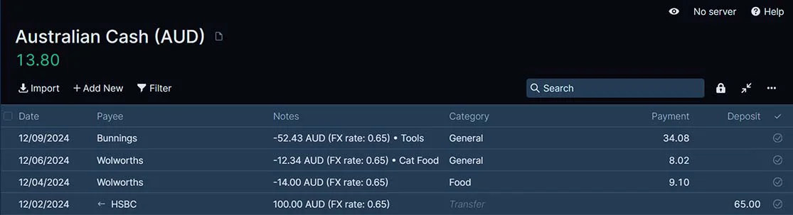 Create a transaction in the foreign currency account using the foreign currency amount. (i.e., if the normal budget currency is USD but the account is AUD, then enter the AUD amount in the Payment or Deposit column).