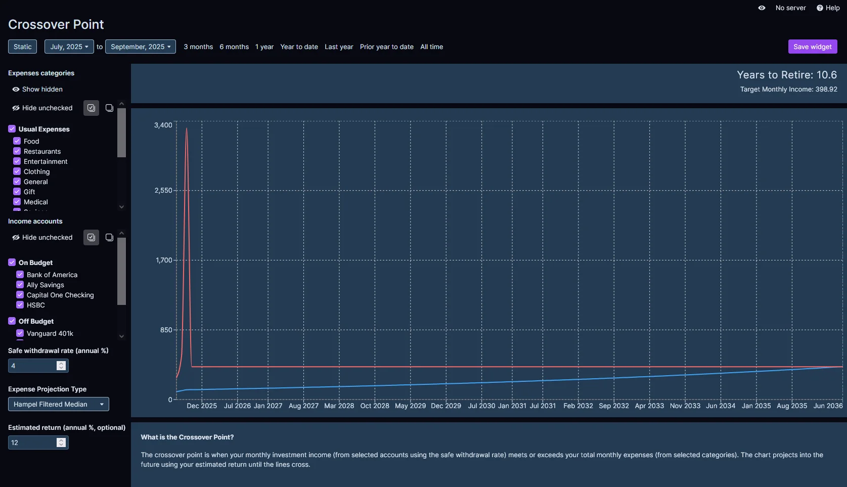 Expense CategoriesSpecify which Actual Budget categories are expenses that will continue beyond retirementUsed to project expenses into the future to determine when passive income will cover living expenses.